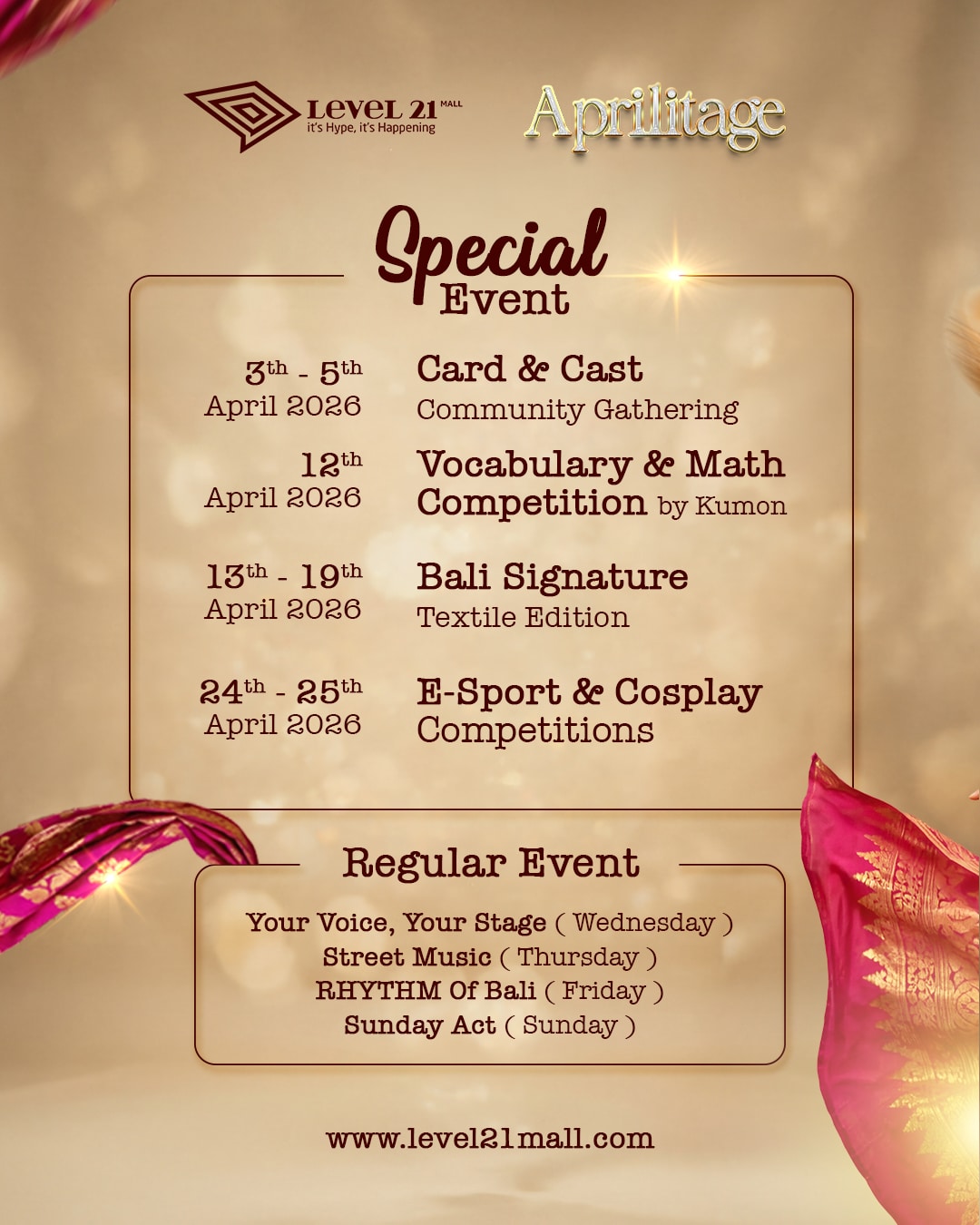Denpasar, April 2026 – Level 21 Mall kembali menghadirkan inovasi program tematik tahunan yang inspiratif melalui Aprilitage 2026, sebuah perayaan budaya yang mengusung semangat “Celebrate