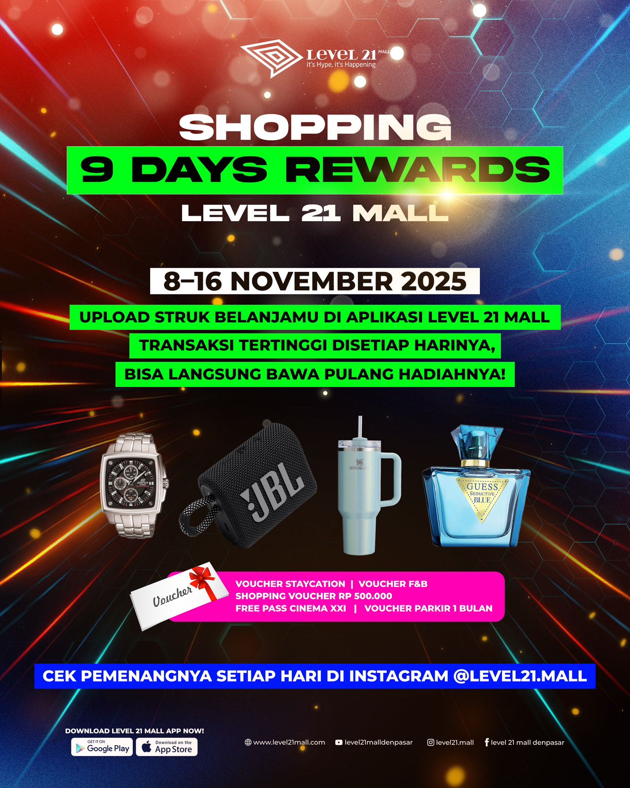 Hi Levellers, Dalam rangka #9LOW – 9𝘁𝗵 𝗔𝗻𝗻𝗶𝘃𝗲𝗿𝘀𝗮𝗿𝘆 𝗼𝗳 𝗟𝗲𝘃𝗲𝗹 21 𝗠𝗮𝗹𝗹, ada kejutan spesial buat semua Member aplikasi Level 21 Mall! 💚 ✨ 𝗦𝗛𝗢𝗣𝗣𝗜𝗡𝗚 9 𝗗𝗔𝗬𝗦